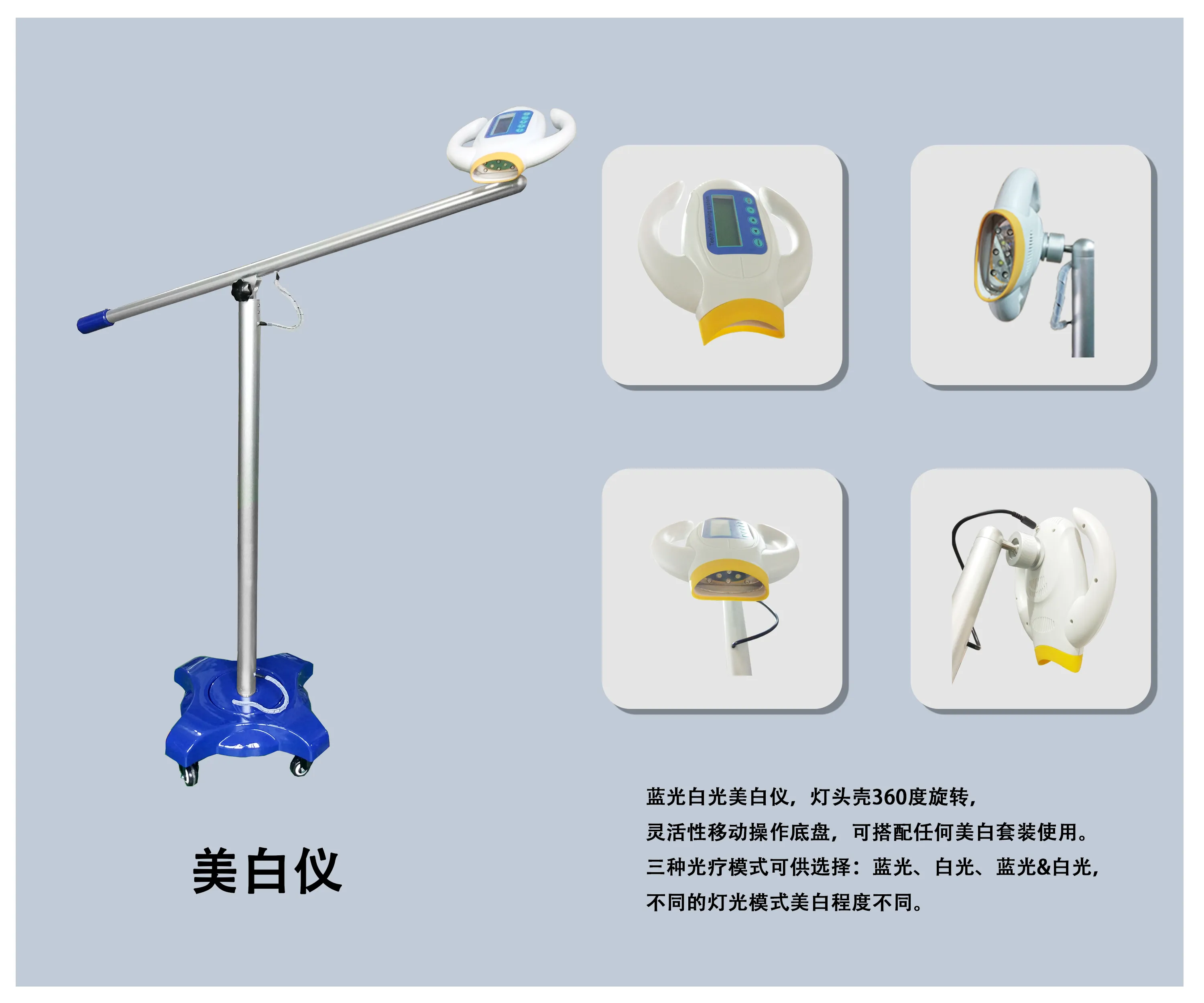 The blue light self luminous beauty instrument has a lamp head shell that can rotate 360 degrees, allowing for flexible movement and operation of the chassis. It can be used with any beauty self kit. There are three phototherapy modes to choose from: blue light, self light, blue light&self light, and different lighting modes have varying degrees of whitening.