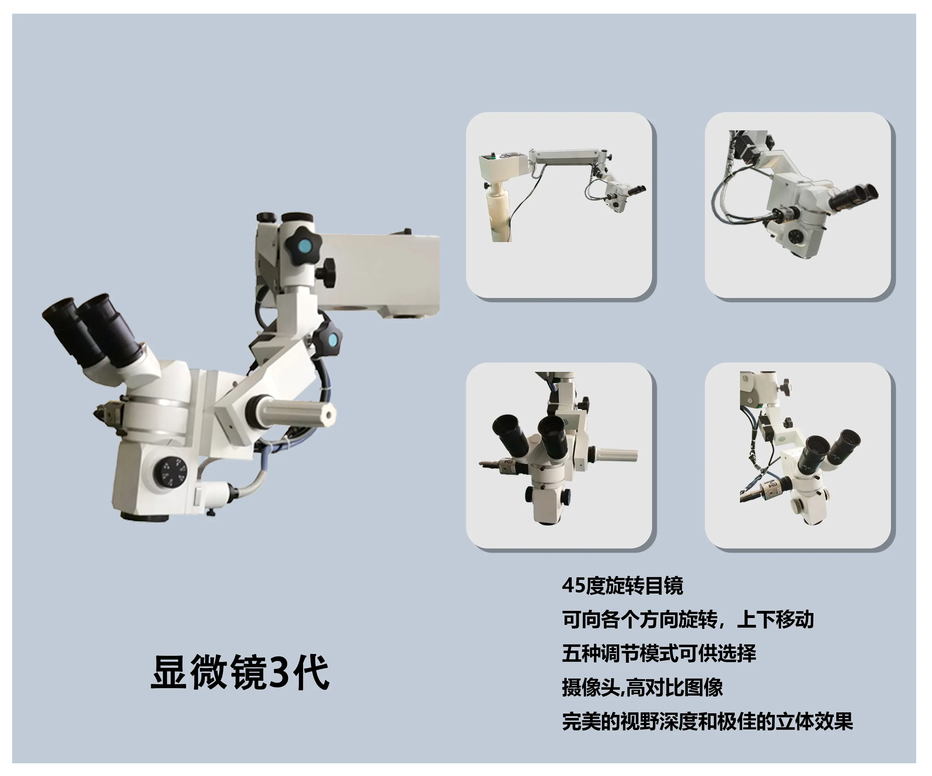 Product Code: 21 Usage: Teaching, surgery, implantation, etc. The microscope has a working distance of 20-25cm and can be adjusted with an electric foot pedal. There are 5 zoom modes to choose from: A (3. X), B (4.9X), C (8.3X), D (13.9X), E (20.4X). The fiber optic lamp can be adjusted to high, medium, or low