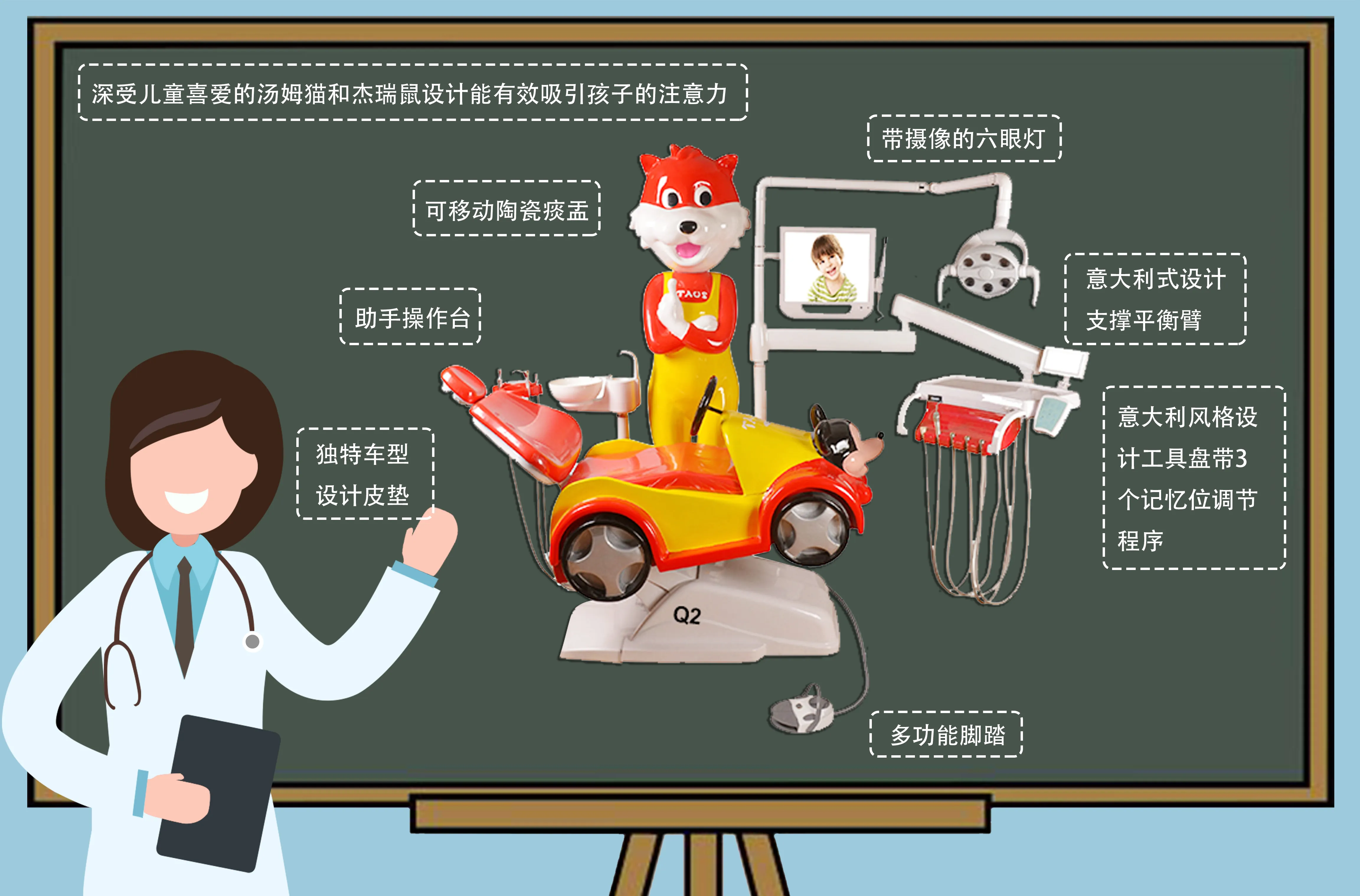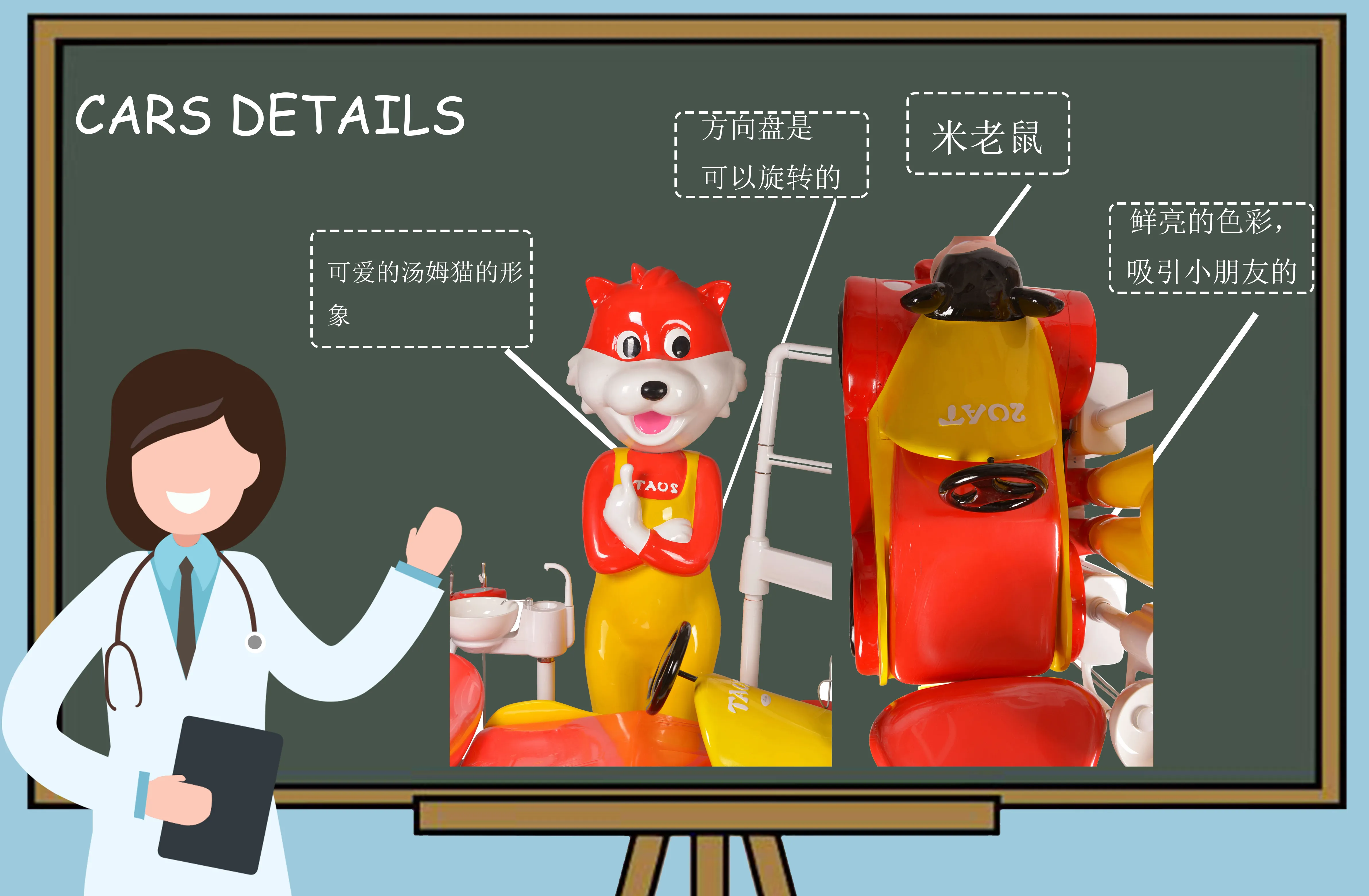 Tom Cat Children's Chair reduces children's fear of dental treatment, with a built-in music system that allows them to input various music according to their preferences