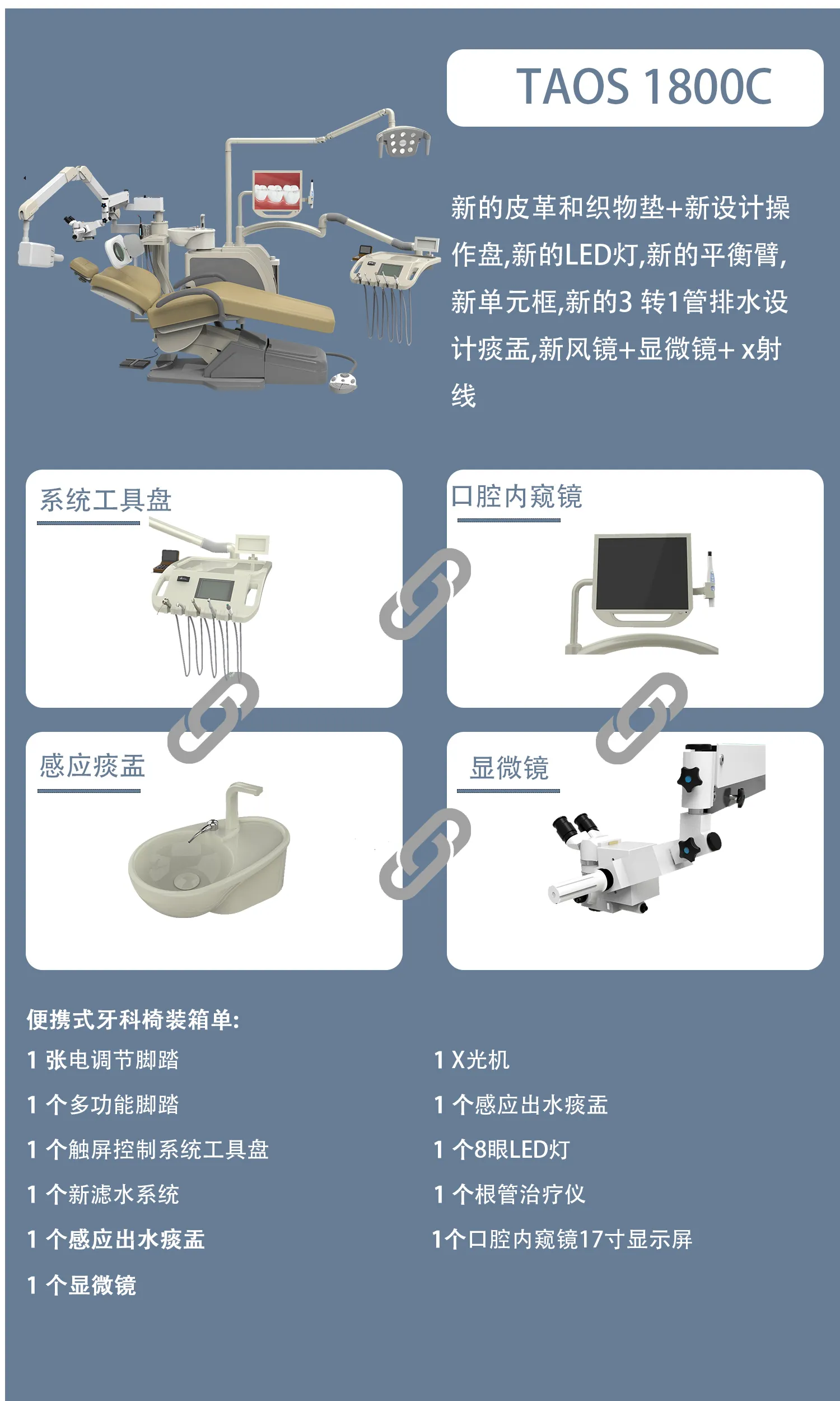 New leather and fabric pads+newly designed operating panel, new LED lights, new balance arm, new unit frame, new 3-turn 1-tube drainage design spittoon, fresh air mirror+microscope+X-ray
